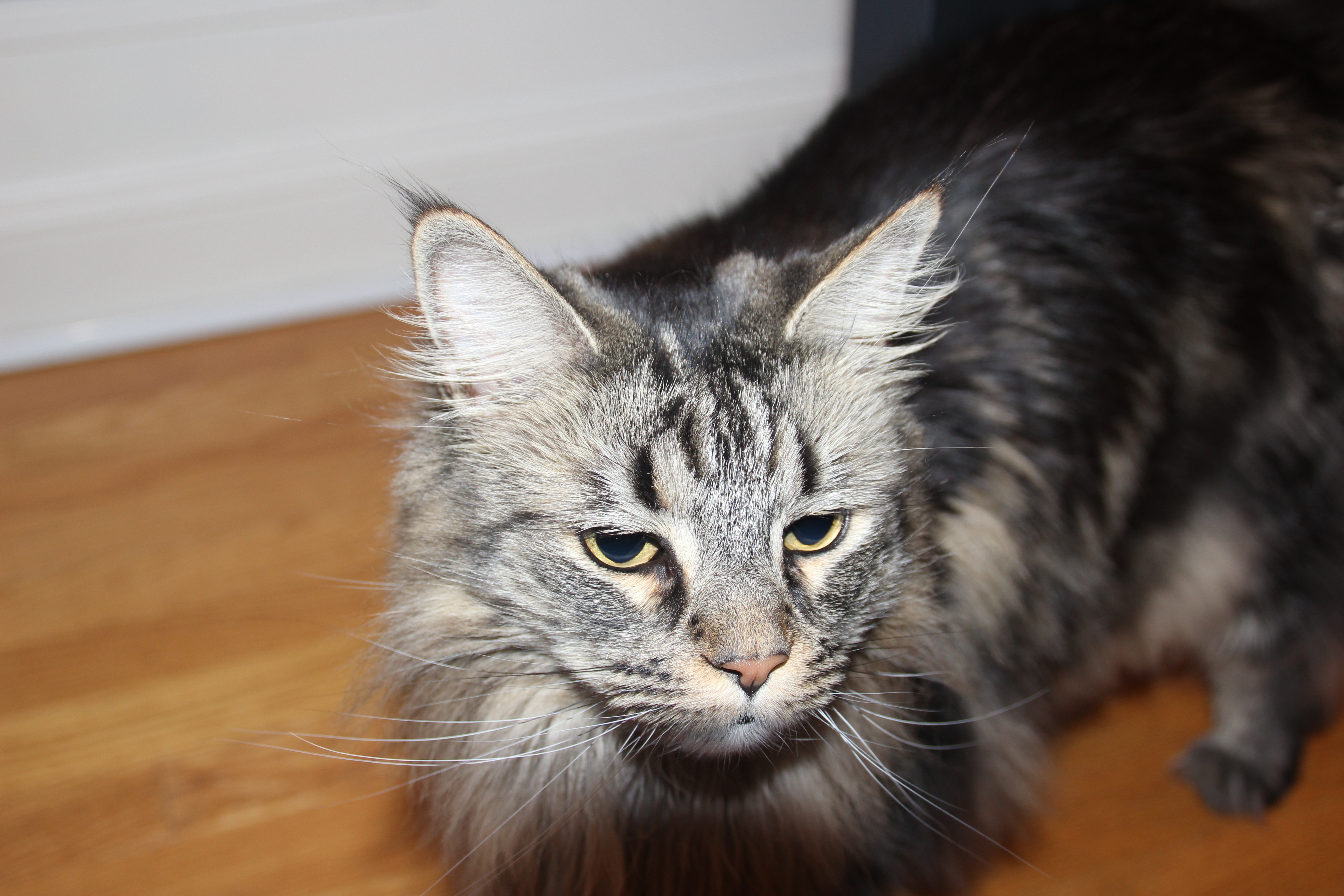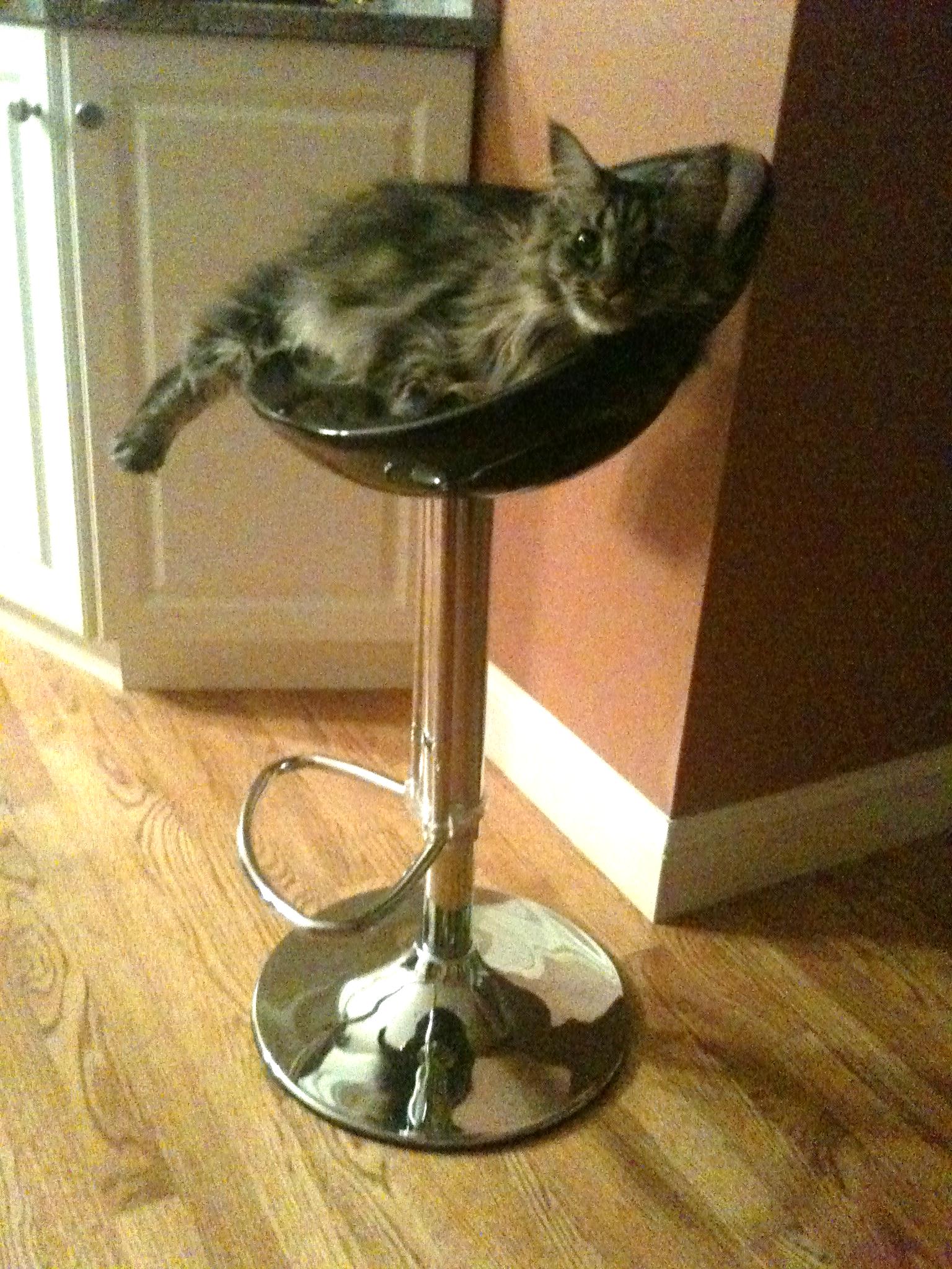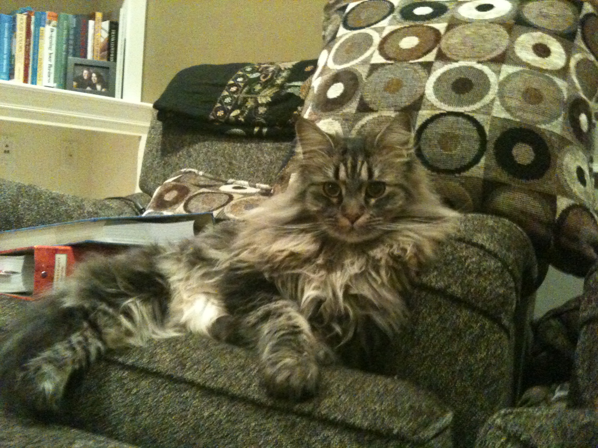 She is nosy on a clinical level, which leads me to believe she is half raccoon. She would prefer to spend her days making bird noises (strange, given she’s a CAT), rummaging through small waste baskets (thus leaving a crime scene on the floor) and dragging food scraps out of a sink of dirty dishes. So far, my attempts to discipline her have been unsuccessful. If her behavior gets any worse, I am threatening to send her to a feline correctional facility. Here’s how she feels about that (note: photo taken after an altercation with the vacuum hose, her nemesis):