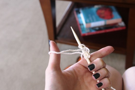 Then we put the needle through the loop and cast on a stitch. It took me a while to get the hang of this and realize that I need not re-loop the yarn through my fingers for each stitch.