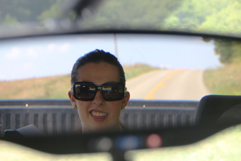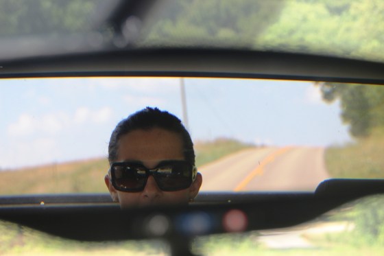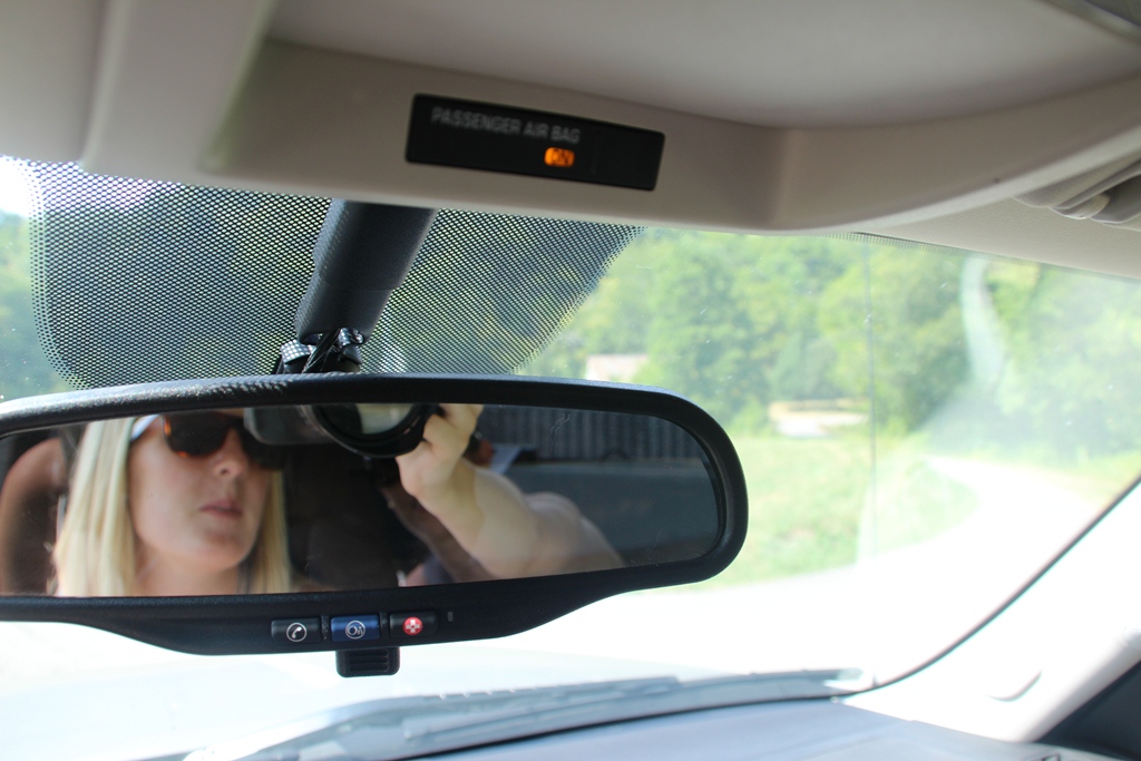 Eugene took this picture of me in the rear view mirror as we stopped to check out the view.  I think I look like a spy.