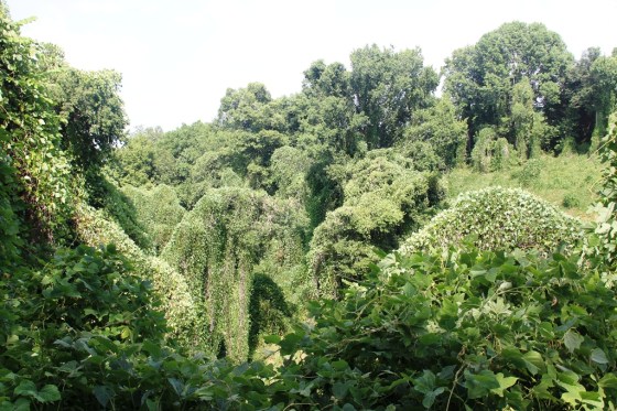 This is kudzu, a vine that was brought to the U.S. to help control soil erosion by covering the ground and holding soil in place.  It turns out that it was an overachiever and has taken over many wooded areas, engulfing the trees in its thick, leafy vines.  It is classified as an invasive species.