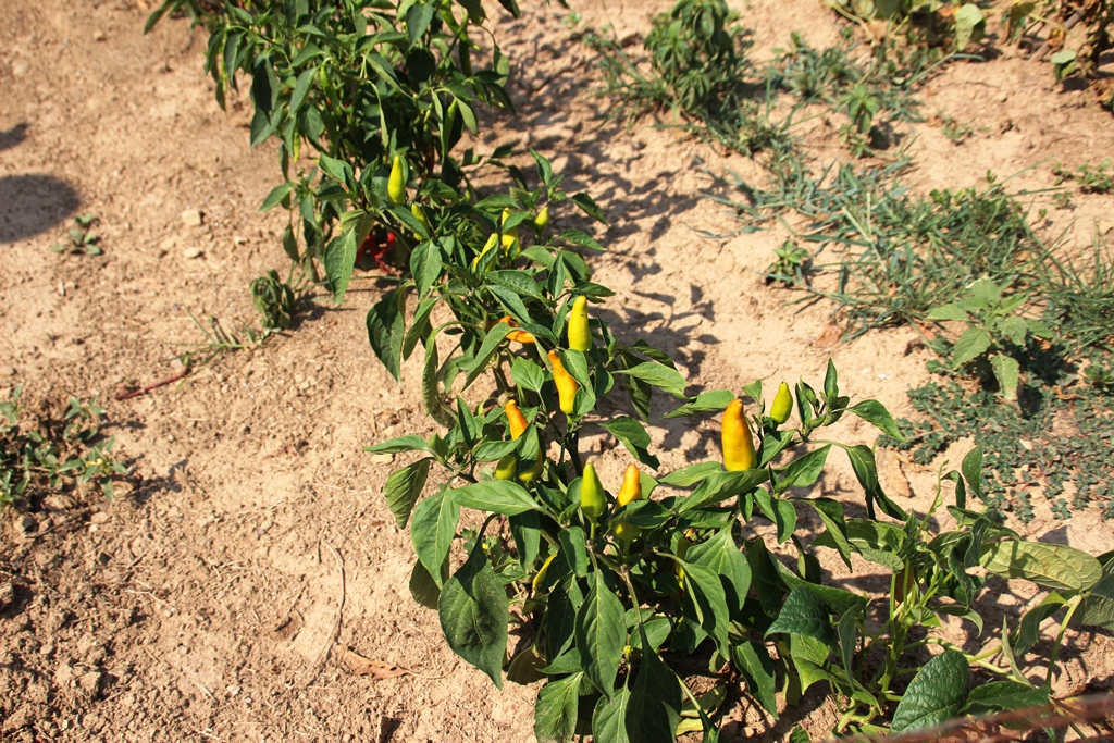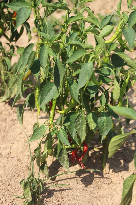 Hiding in here are jalapenos, both red and green. These little devils will set you on fire. Due to the extremely dry conditions, the peppers are much hotter than normal. Thus, the jalapenos that I used to mince up and sprinkle liberally on my beans are now as hot as the cayenne that I used to mince up and sprinkle VERY sparingly on my beans. Imagine my surprise when I took a big bite of beans with lots of jalapeno. I swear I would have breathed out flames if I had opened my mouth. But, luckily for my dining companions, my mother taught me to chew with my mouth closed.