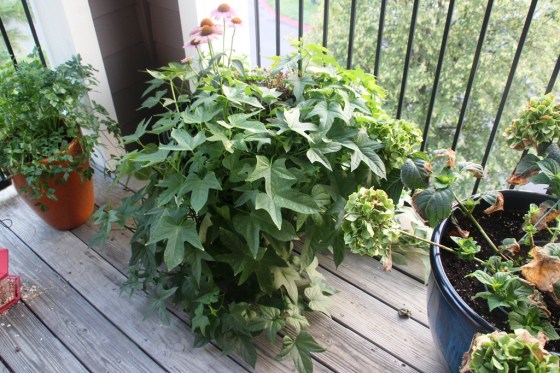 My sweet potato plant has nearly engulfed its container and is starting to crawl across the deck. Weeks of triple digit weather doesn’t seem to have bothered this beast one bit.