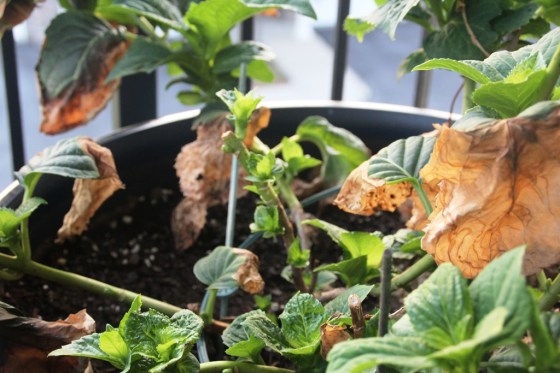 My dear hydrangeas, however, are not as sturdy. The extreme heat started to turn the leaves into crisps, but among the destruction there is new growth sprouting.
