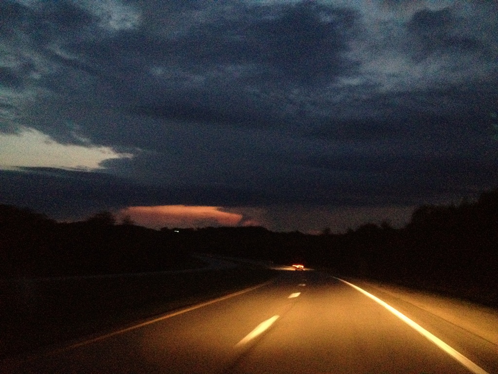After about an hour of chatting with my dad, my reception started to drop off as I approached the middle of nowhere. The middle of nowhere has the best skies, including this one. This grainy picture hardly does it justice. There was an awesome break in the clouds in the distance, where the muted sunset came through and illuminated some far off thunderclouds.