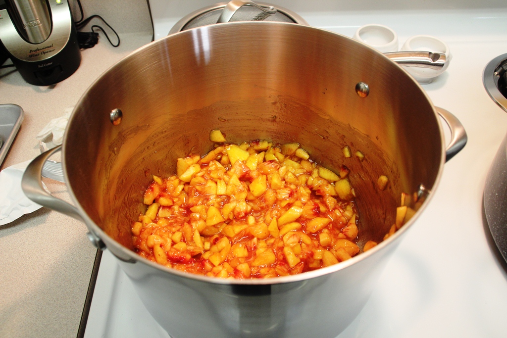 With the jars and lids heating up, I peeled and chopped up the peaches and then poured them into the pot with the lemon juice.  Then I stirred in the pectin.