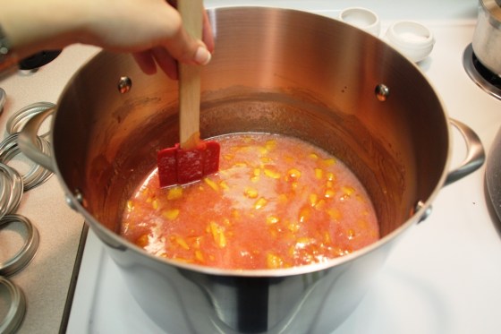 There’s a lot of stirring that goes on at this stage until the mixture comes to a hard boil.  After about 1 minute of this, you turn it off and it’s ready to be jarred!