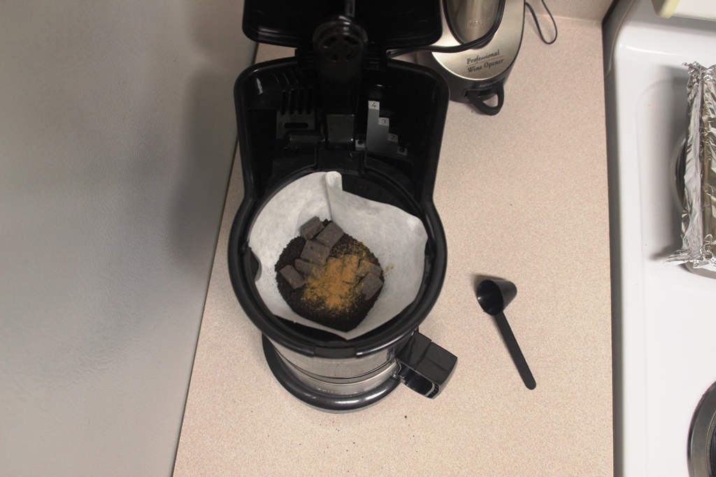I doctored up my coffee with some chocolate chunks and cinnamon to take the crude oil edge off.