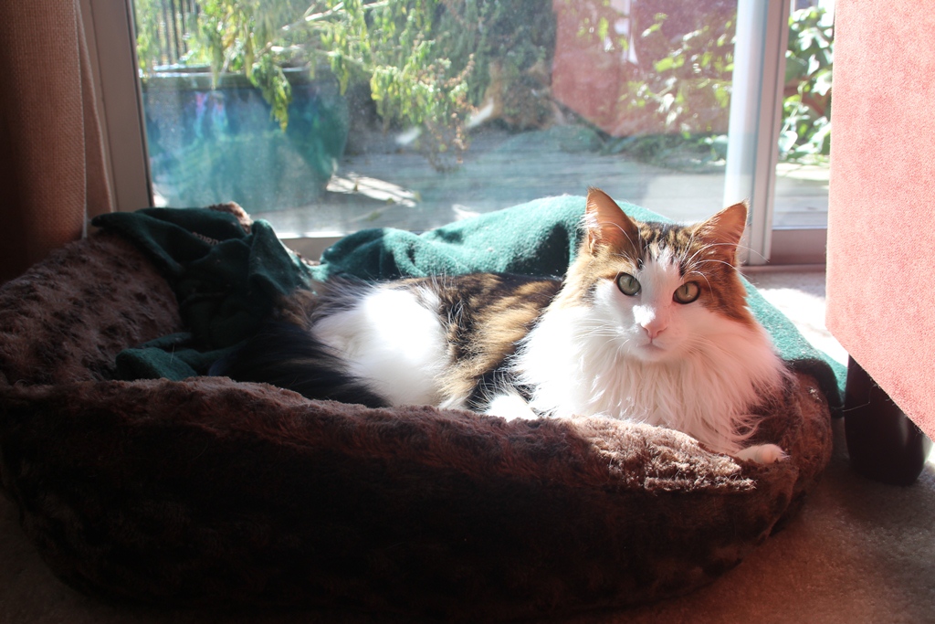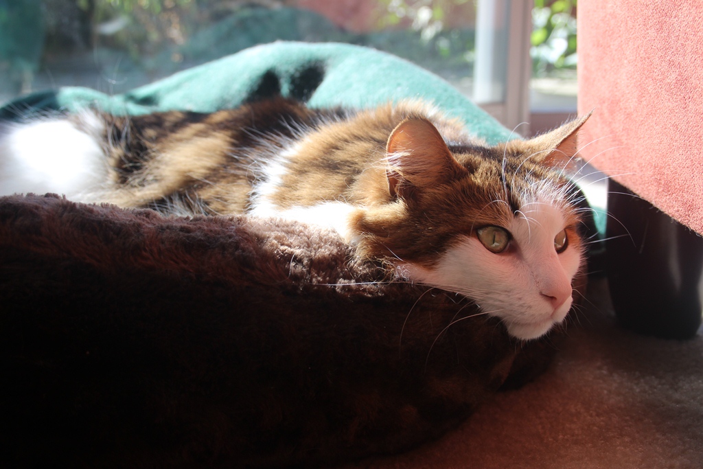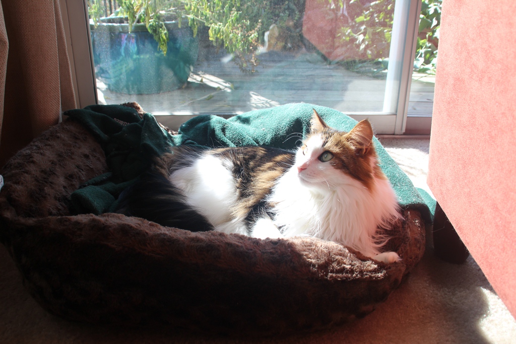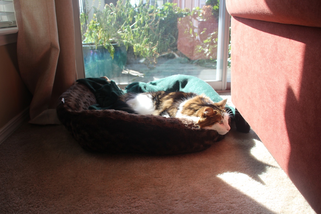 He was lounging in his cat bed, staring blankly into space one sunny afternoon by the sliding door.