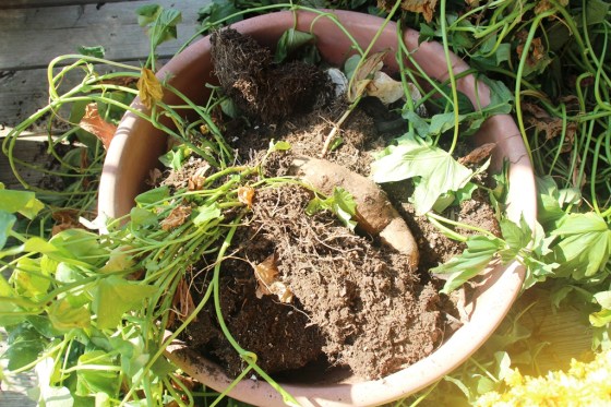 With the weather cooling down and fall setting in, I decided it was time to change out my planters and put in some mums. In anticipation of this transition, I was letting my sweet potato vines die back. I was very curious to see what was left for me underneath the surface of the soil.