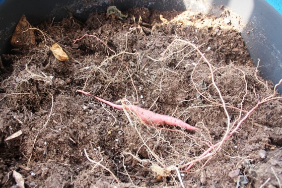 As I cleared out the roots of my larger vine, I discovered that the sweet potato that grew from my “plant a chopped up potato” technique (as opposed to my “plant the whole potato” technique), did yield a very spindly sweet potato spawn. I planted the sweet potatoes for their vines so I wasn’t counting on having a bumper crop of sweet potatoes, though I did hope I would have some sort of surprise to dig up.