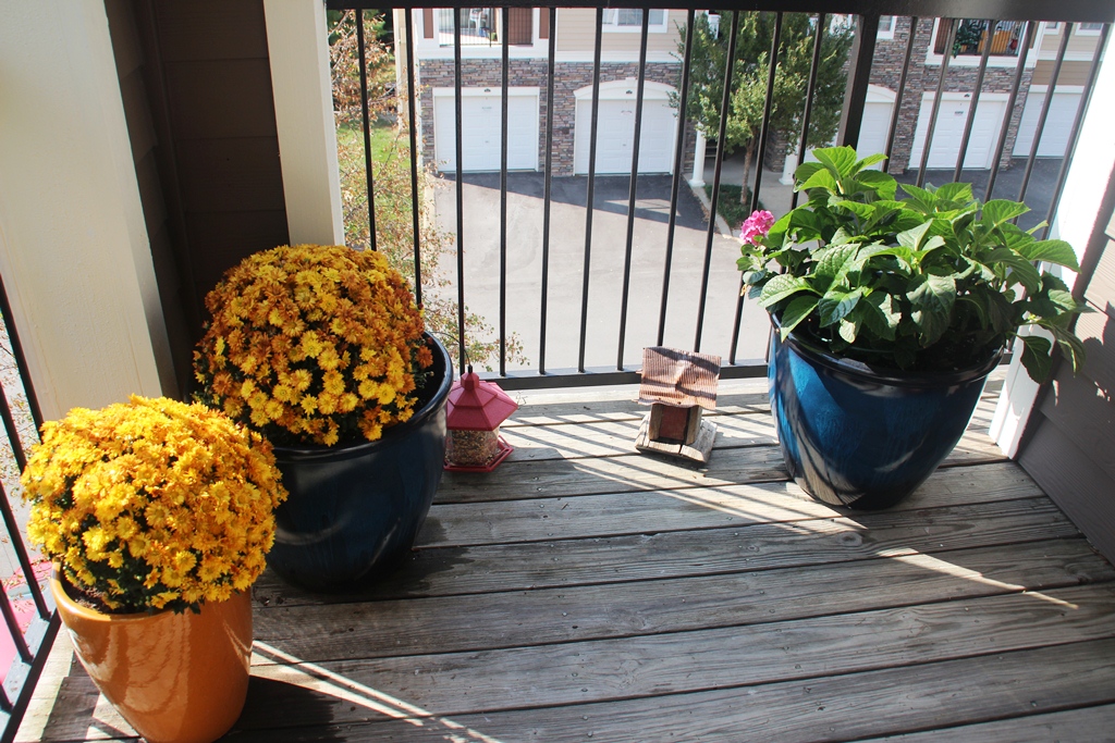 I’m really enjoying my mums already. I can see them from my kitchen sink and my living area. They’re so bright and cheery and the perfect symbol of fall. Now that I have more room after today’s potato vine massacre and now that the temperature is consistently 80 or below, I may actually get that rocking chair down here from Burkesville and set on the porch a while.