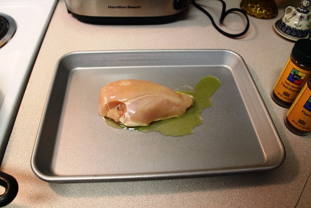 Preheat the oven to 400 degrees.  Rub a boneless, skinless chicken breast with olive oil.