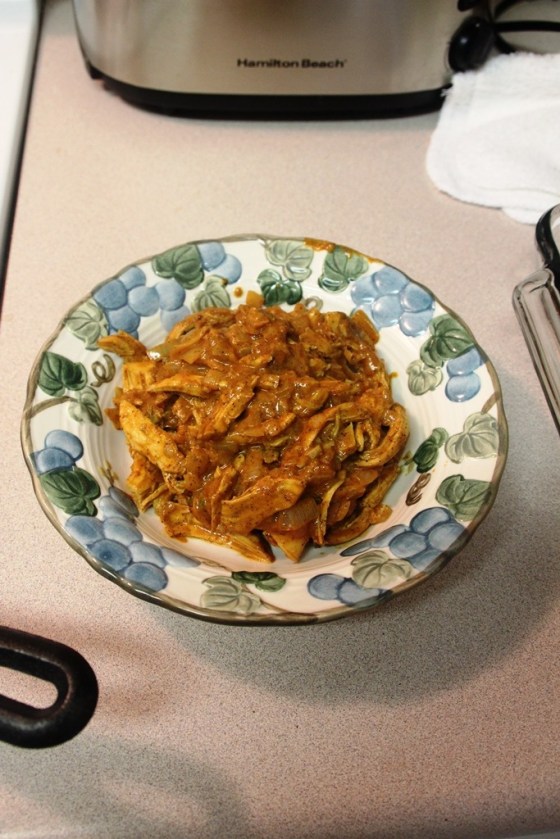 1)      Cover chicken breast in 1 tbsp olive oil and then season with 1 tsp chili powder, ½ tsp paprika, ¼ tsp season salt and ¼ tsp garlic salt.  Bake at 400 degrees on a baking sheet for 20-25 minutes or until cooked through.  Let cool and then shred chicken.