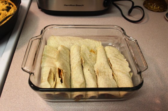 Then start assembling by placing 1/8 of the chicken mixture in each tortilla, rolling them up and placing them in the baking dish as you go.