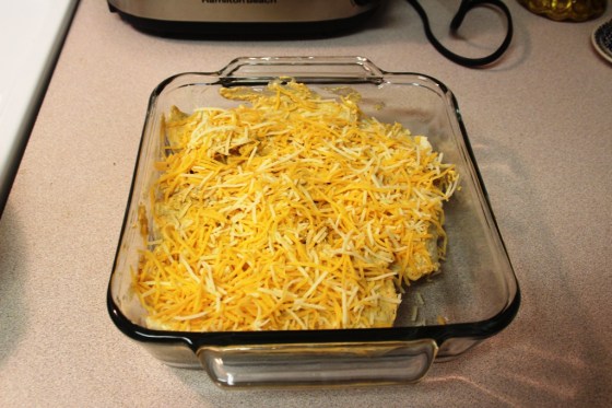 6)      Assemble tortillas, placing them in a baking dish.  Once all tortillas are assembled, cover them with cream cheese sauce and shredded cheese.