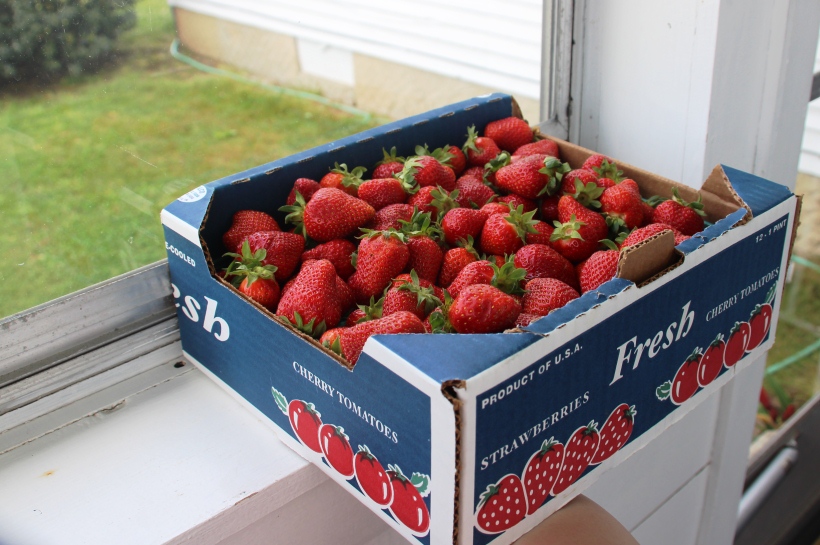 You don’t actually need this many berries unless you want to make over a dozen pints of jam, which you very well might once you taste this jam on a biscuit. Grandmother and I got a little ahead of ourselves on the quantity of berries we purchased and probably only used ¼ of this box for 4 pints of jam. We did, however, manage to eat the leftover berries for dessert in the form of strawberry shortcake just to mix things up. Ha.