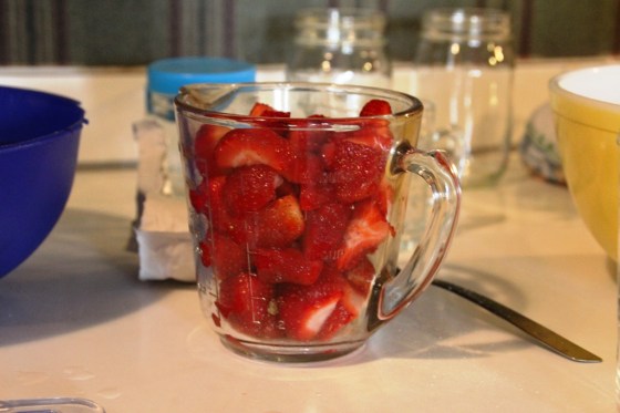 Measure out 2 full cups of strawberries. Really pack them in so you maximize the strawberry-ness.