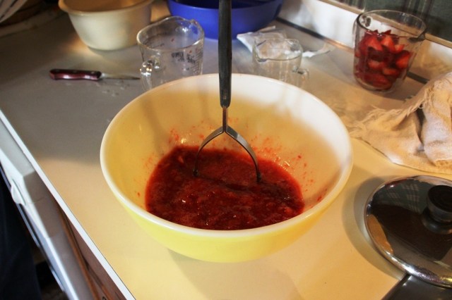 This is the fun part (other than the most fun part: eating the jam): Mash the strawberries until completely broken down. I suppose there are several ways to do this, but a potato masher is my weapon of choice.