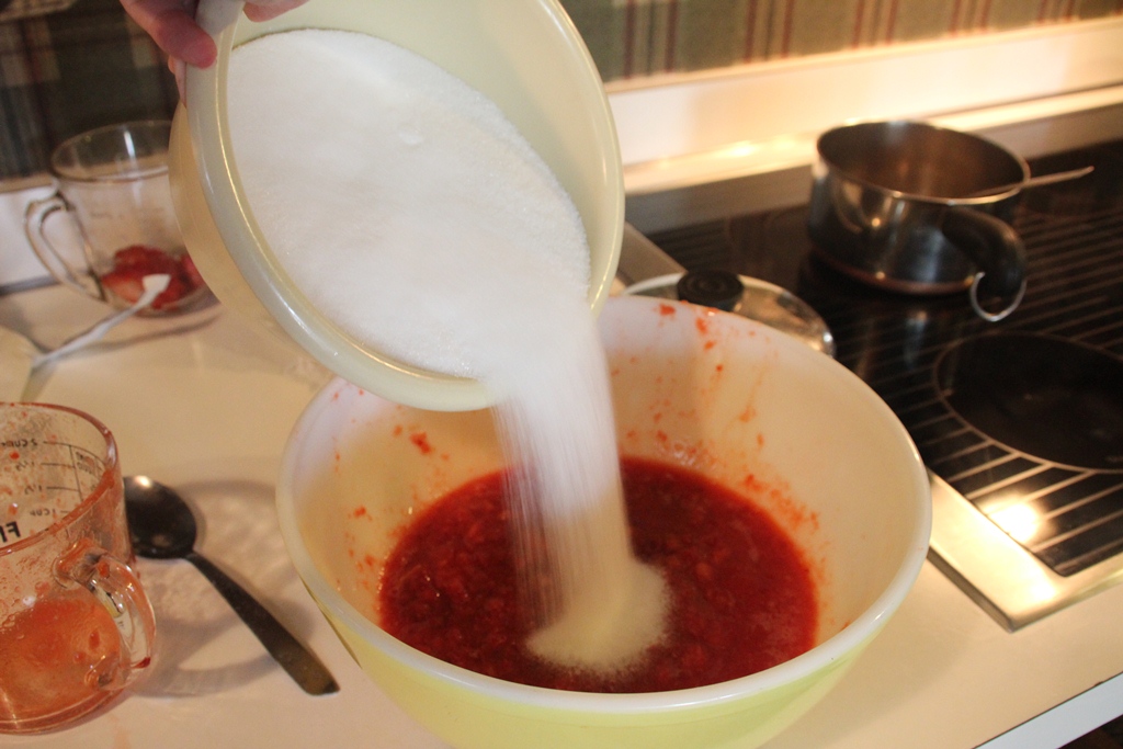 Once the berries are mashed up well, add an absurd amount of sugar (4 cups).