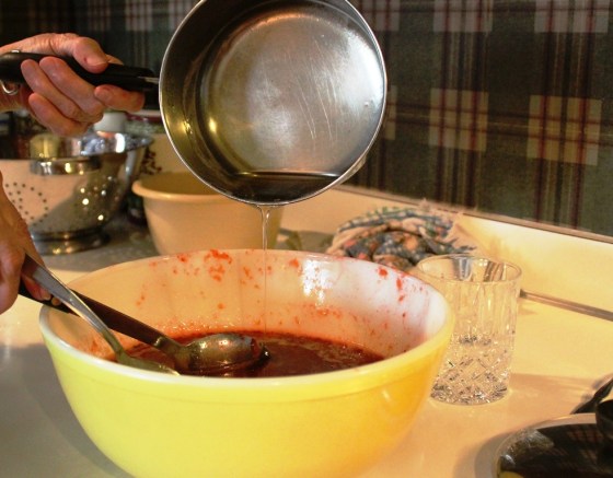 Then carefully pour the hot, thickened pectin into the strawberry mixture after its 10 minutes is up.