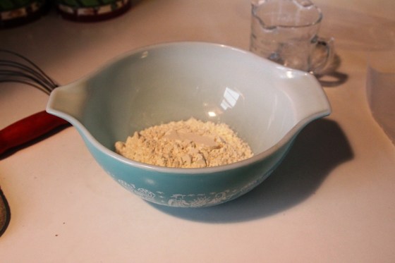 First, measure out 1 cup of flour and dump it in a mixing bowl.