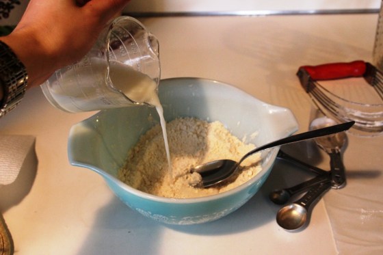 Add about 1/3 cup of milk and stir the ingredients together until combined. It’s best to add most of the milk and hold a little bit back until you can gauge the moisture level of the dough. You want it to be moistened, but not overly sticky or wet.