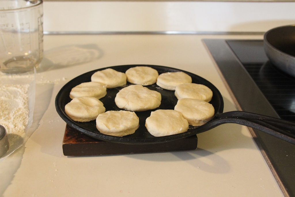 Place the cut out biscuit dough on the greased skillet and pop it in the oven on 425 until biscuits begin to turn golden brown, about 10 minutes.