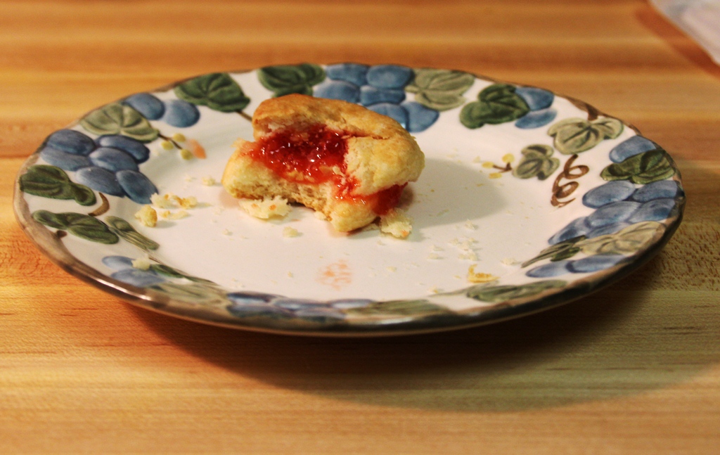 This is what the biscuit and jam (and butter if you’re absurd like me) looks like assembled and partially eaten. I had to take a bite to show you what it looked like on the inside. That, and I was so excited I forgot to take a picture until I had taken a bite.