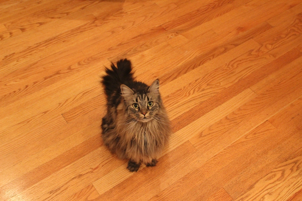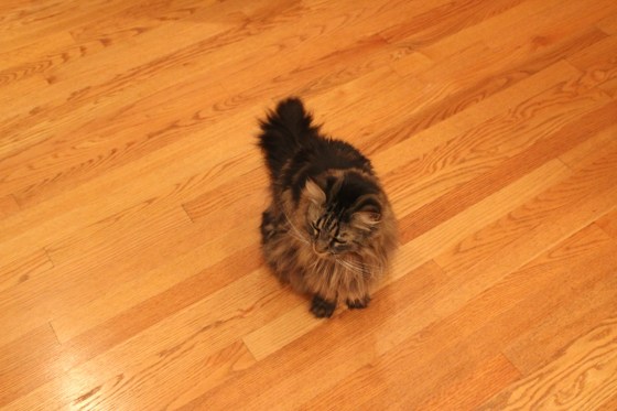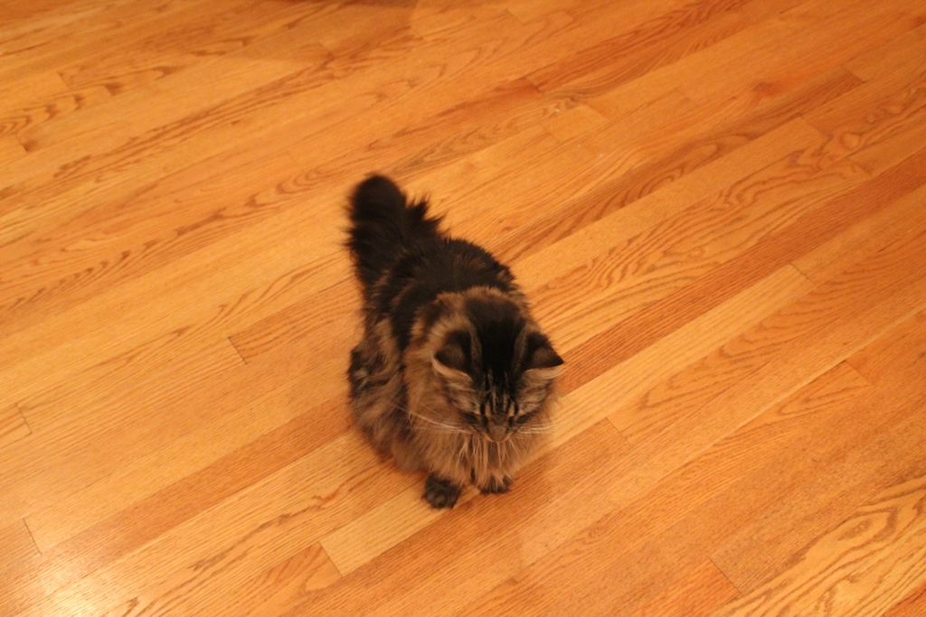 Sometimes there is evidence that she has been on the counter, such as a stray paper towel or green bean on the floor. One time, I found the remnants of a rib-eye steak on the floor half-way across the kitchen and Scarlett was nowhere to be found (behind a chair), licking her chops.