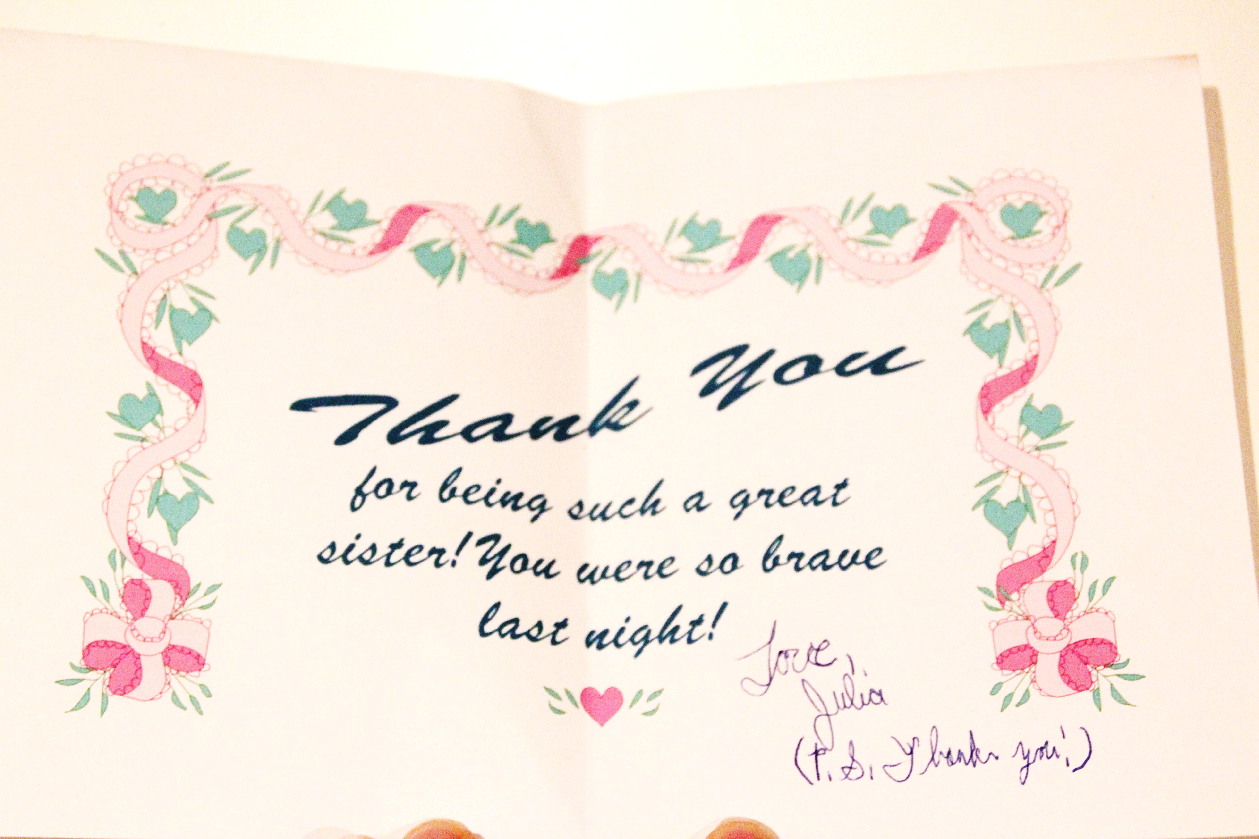 Although she has no recollection of this card, judging by its content, her lovely cursive handwriting, and the fact that this card was created using a card program popular in our household at the turn of the century, I have concluded that this card dates back to the day after my sister tried to amputate her arm.