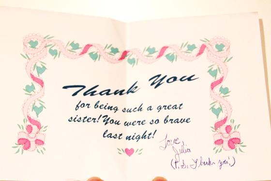 Even though she was the brave one for not freaking out when she stuck a pair of scissors in her finger, she made this very nice card to thank me for taking care of her. The card was very sweet and thoughtful, but the P.S. note cracks me up: